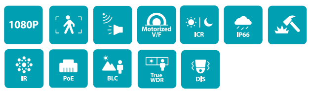 Уличная булет камера DC-T1233WHX с варифокальным моторизированным объективом с фокусным расстоянием f=3,3 – 10 мм, функцией True-WDR и функцией стабилизации изображения. Частота передачи видеосигнала камеры — 30 кадров/с. IP-камера имеет диапазон угла просмотра от 33,5 до 99,8 градусов по горизонтали, инфракрасную подсветку с дальностью действия до 30 метров. IP-камера способна отрабатывать следующие события: детекция движения, взлом, пересечение зоны.