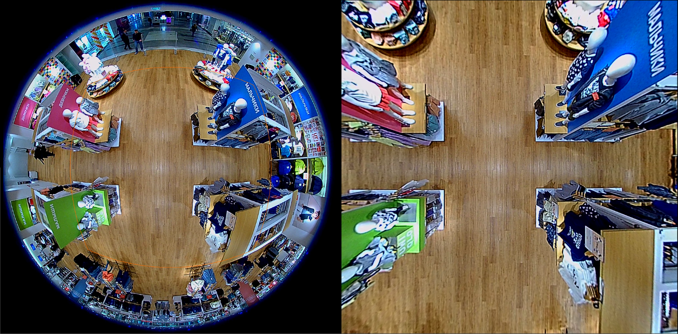 Как было описано ранее, для устранения искажений, вносимых fisheye объективом и представления кадра в привычном виде, используются программные средства преобразования изображения различного типа, которые называются деварпинг. Деварпинг может осуществляться на стороне камеры или на стороне управлеющего ПО. Более функциональным является деварпинг на стороне ПО, поскольку в этом случае всегда будет записываться полный кадр с камеры и оператор сможет пользоваться функциями деварпинга не только во время прямой трансляции, но и в архиве, а также после экспорта видеозаписи.